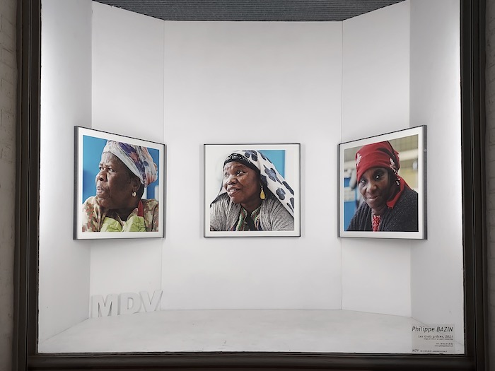 L'exposition à la galerie MDV seul lieu d'art contemporain à Arras, présente un triptyque des portraits d'entretiens réalisés au Blanc-Mesnil dans le cadre du projet de création Le Tilia (2021-2024). La galerie est une vitrine donnant sur la rue Baudimont.